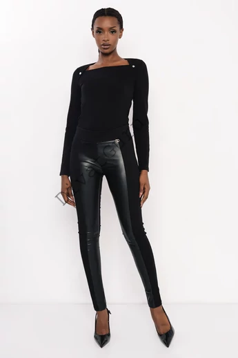 Egy nő ruhatárából sem hiányozhat egy szűk nadrág, amely bármely look-hoz bármilyen évszakban bevethető. Az AMNESIA Kiszi nadrág műbőr-punto anyag kombinációja feldobja basic szettjeidet, akár egy bőfelsőt, akár egy feltűnő body-t veszel fel hozzá. Válaszd fekete vagy homok színben.