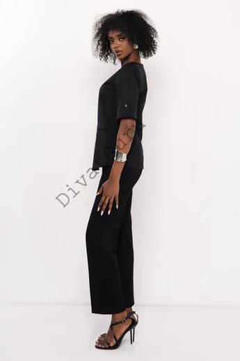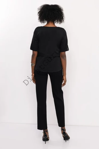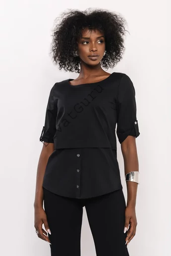Az AMNESIA Banola felső elegáns és modern darab, amely a letisztult vonalvezetést játékos részletekkel ötvözi. A felső monaco és puplin anyag kombinációjából készült, amely egyszerre biztosít tartást és könnyed esést. A rövid ujjakat visszahajtással és állíthatóra terveztük, míg az elöl látható dupla réteg és a patentos részlet különleges karaktert ad a darabnak. A modell magassága 175 cm. A modell méretei: mell - 74 cm, derék - 65 cm, csípő - 95 cm. Anyag: Monaco anyagunk könnyed, finom szövésű textil, amely elegáns tartást ad a felsőnek, miközben kényelmes viseletet biztosít. Puplin anyagunk szép fénnyel rendelkező, jól szellőző és tartást adó textil, amely klasszikus választás blúzokhoz és ingekhez. A két anyag kombinációja különleges megjelenést kölcsönöz, és ideális az őszi-téli szezon réteges öltözködéséhez.