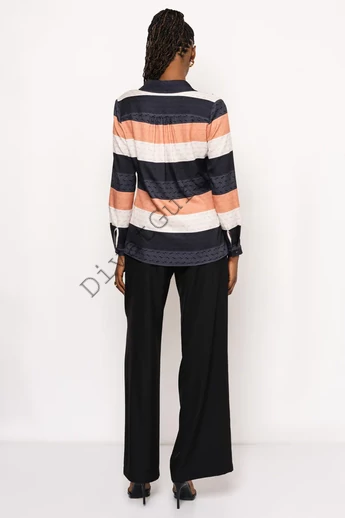 Az AMNESIA Mia blúz a klasszikus ingek világát ötvözi a modern részletek eleganciájával. A különleges, saját tervezésű logómintás csíkos anyag ősz-téli kollekciónk egyik újdonsága, amely finoman játszik a színekkel és textúrákkal. A latina anyag lágy esése és kellemes tapintása kényelmes viseletet biztosít, miközben letisztult, stílusos megjelenést nyújt. A modell magassága 175 cm és S-es méretet visel. A modell méretei: mell - 74 cm, derék - 65 cm, csípő - 95 cm. Anyag: Latina anyagunk közepesen vastag, finoman rugalmas és selymes tapintású textil, amely lágy esésével elegáns megjelenést kölcsönöz. Kényelmes viseletet biztosít a hűvösebb napokon, így ideális ruhákhoz és tunikákhoz az őszi-téli szezonban.