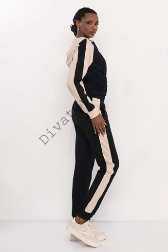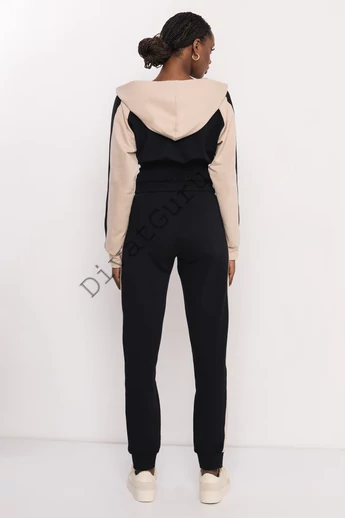 Az AMNESIA Glenna jogging szett egyszerre kényelmes és trendi választás a mindennapokra. A fekete alapon bézs betétekkel kombinált dizájn modern, sportos hatást kelt, miközben nőies lookot ad. A kapucnis felső és a letisztult nadrág tökéletes összhangban alkot teljes szettet. Anyagtípustól függően a terméken mért méretek 1-2 cm-t eltérhetnek a feltüntetettektől. A modell magassága 175 cm és S-es méretet visel. A modell méretei: mell - 74 cm, derék - 65 cm, csípő - 95 cm. Anyag: A futter anyag sportos, mégis nőies darabok kedvelt alapanyaga, amely az őszi-téli kollekciók elengedhetetlen része. Belső oldalán enyhén bolyhos, meleg és puha felületével extra komfortot ad a hétköznapokban. Strapabíró, divatos anyag, amely kényelmes viseletet biztosít minden női ruhában.