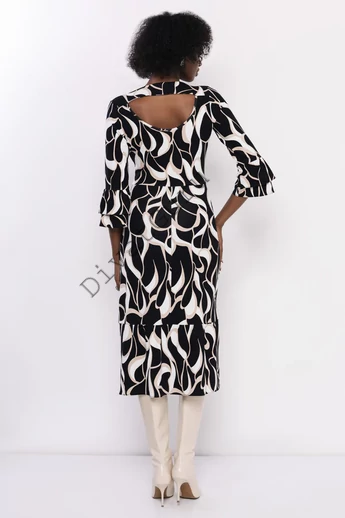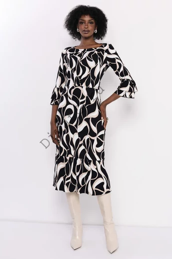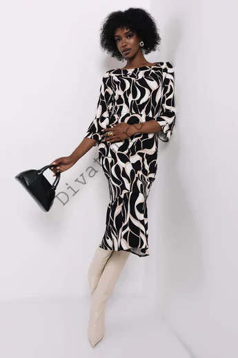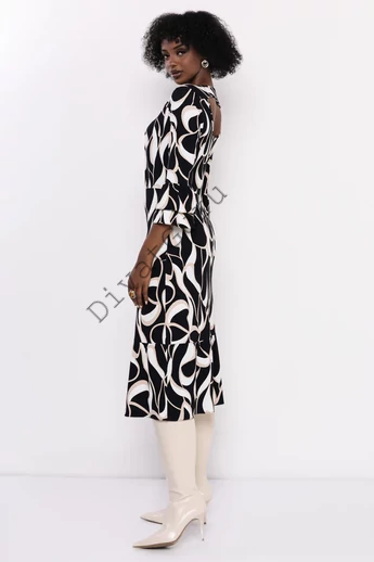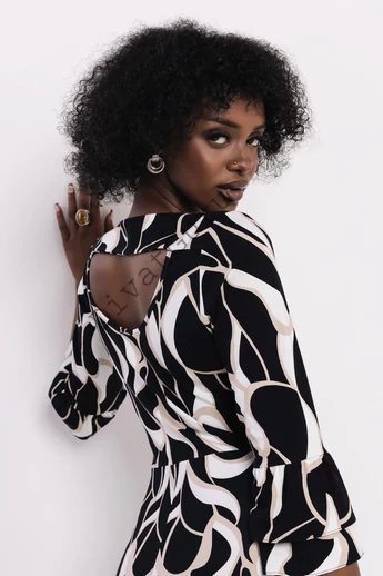 Az AMNESIA Foxti ruha látványos, fekete–ekrü–bézs mintás darab, amely a nőies eleganciát modern könnyedséggel ötvözi. A selyemfényű viszkóz anyag lágyan követi a test vonalát, miközben kényelmes viseletet biztosít egész nap. A hajtásokkal díszített, enyhén harang ujj és a nyitott hátmegoldás finom, nőies részletet ad a ruhának, míg a térdig érő hossz és a lágy esés elegánsan nyújtja az alakot. Anyagtípustól függően a terméken mért méretek 1-2 cm-t eltérhetnek a feltüntetettektől. A modell magassága 175 cm és S-M méretet visel. A modell méretei: mell - 74 cm, derék - 65 cm, csípő - 95 cm. Anyag: A selyem-viszkóz anyag lágyan omló, selymes tapintású textil, amely egyszerre elegáns és kényelmes viselet. A természetes eredetű viszkóz szálak légáteresztővé és kellemesen hűvössé teszik az anyagot, míg a selyemfényű felület finom, nőies megjelenést kölcsönöz a ruhadarabnak.